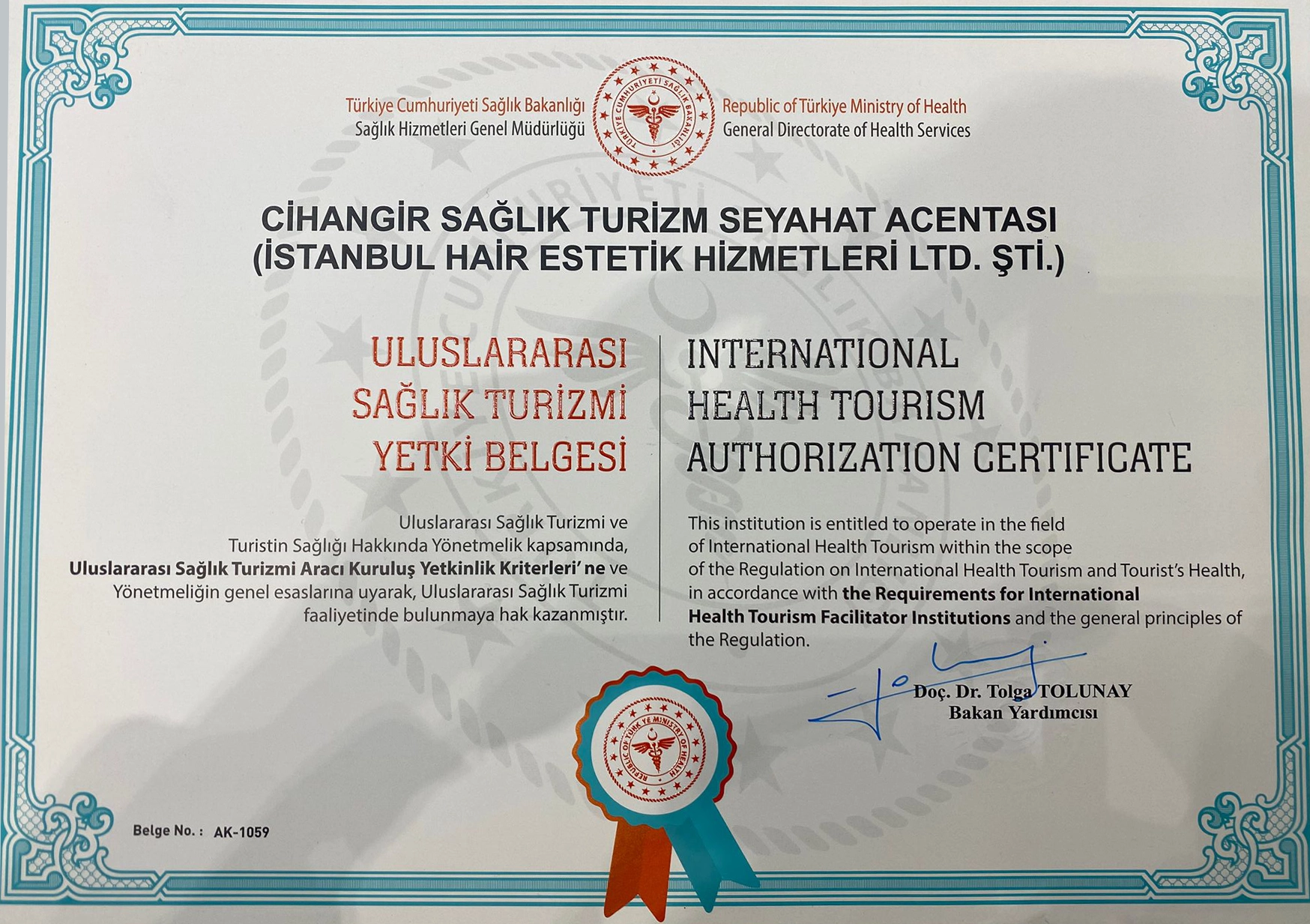 Cihangir Health Tourism Travel Agency (Istanbul Hair Aesthetic Services Ltd. Co.) is entitled to operate in the field of International Health Tourism within the scope of the Regulation on International Health Tourism and Tourist Health, in accordance with the Requirements for International Health Tourism Facilitator Institutions and the general principles of the Regulation.
